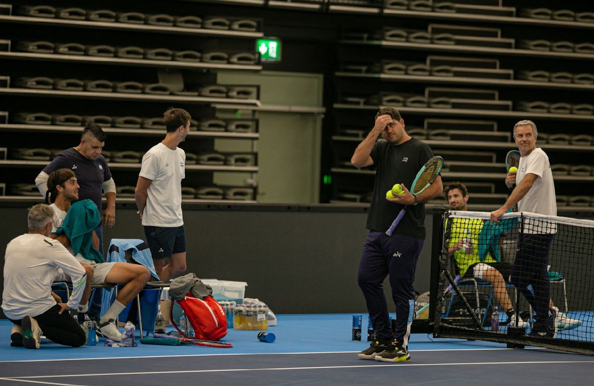 Primer entrenamiento de toda la Selección Argentina de Tenis de Copa Davis juntos en Noruega. Los dirigidos por Javier Frana, que ayer habían llegado y entrenado en forma parcial, se le sumaron los que faltaban para ahora si estar todos pensando en enfrentar el 30 y 31 de enero en Fjellhamar y en superficie rápida bajo techo, al equipo local.